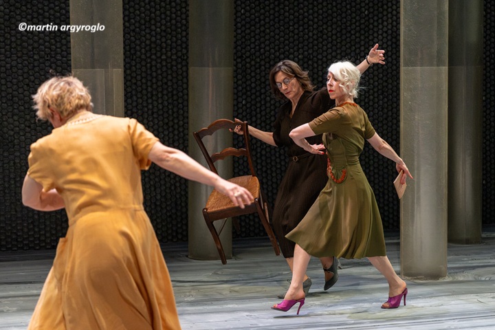 C’est donc une gageure que de la porter à la scène aujourd’hui. Or, le défi est brillamment relevé par la mise en scène de Thibaud Croisy. Il a eu l’intelligence de creuser la singularité de la pièce – à savoir sa distribution -, en la renouvelant complètement. Il nous épargne l’accablant défilé d’une théorie de silhouettes féminines uniformément vêtues de noir, au profit d’une représentation complexe et diversifiée de la féminité. La première bonne idée du spectacle est d’avoir choisi des comédiennes plus âgées que leur rôle (pour les filles), chargées d’histoires théâtrales très différentes, qui apportent une grande diversité sur le plateau, tout en jouant vraiment ensemble. La seconde idée forte est d’avoir confié le rôle (important) de la servante la Poncia à un homme, Frédéric Leidgens (un habitué des mises en scène de Th. Croisy). Du coup, la représentation de la féminité apparaît clairement pour ce qu’elle est, au théâtre comme dans la vie : une construction. Leidgens s’en donne à cœur joie dans l’exécution de sa partition, et les comédiennes (toutes excellentes) sont au diapason. On a un peu l’impression de voir un spectacle sur des femmes joué par des actrices imitant (avec subtilité) des drag queens. Le tout, sans tomber dans la caricature et les effets faciles, car la mise en scène est extrêmement tenue, le plateau est investi avec rigueur et élégance, et le jeu constamment inventif et virtuose. La pièce est nettoyée de toute espagnolade, et c’est tant mieux.