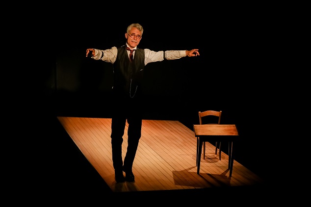 En adaptant à son choix, en mettant en scène si justement et interprétant à merveille l’œuvre fragmentaire et posthume du poète portugais qu’est le fameux Livre de l’intranquillité, David Legras parvient à nous en livrer la substantifique moelle, sa quintessence poétique et philosophique. Son jeu captivant, fait de modulations infinies de ton, de variations d’affects, d’une diction admirable et d’une fantaisie doucement ironique, est un vrai bonheur de théâtre. Le comédien est en parfaite résonance avec Pessoa pour qui seul l’art peut donner sens à l’existence de ce « pauvre diable d’humanité ». C’est précisément avec un art accompli de la scène que David Legras nous raconte la vie vide d’un personnage banal, d’un homme qui ne se sauve (partiellement) de l’absurde que par des réflexions faites avec un art aiguisé de la dissection des illusions et vanités de ses semblables et des siennes. Le coup de génie théâtral de la compagnie de l’Instant Volé consiste à montrer tout cela avec finesse et esprit de jeu, comme lorsque Soares se lève de sa chaise trop étroite pour exécuter une danse clownesque et ludique sur une musique évoquant la farce de la condition humaine. Chorégraphie insolite et juste d’Ana Yepes.