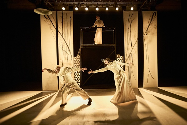 Le piano situé à cour tient un rôle à part entière comme tout le décor (Angéline Croissant pour la scénographie très réussie et Muriel Navarro pour les très belles grandes toiles de fusain ). Shakespeare, Beckett et Chaplin sont convoqués tour à tour. La scène des lettres dictées au Bouffon ou à la Reine qui les tapent à la machine rappellent celle hilarante du filmLe Dictateur. Coincés dans leurs accoutrements royaux (Lucie Duranteau signe des costumes incroyables de justesse grotesque), les personnages s’enferment et finissent pas dégringoler de leur piédestal incapables qu’ils sont de s’ouvrir aux autres et finissent par se heurter au quatrième mur.